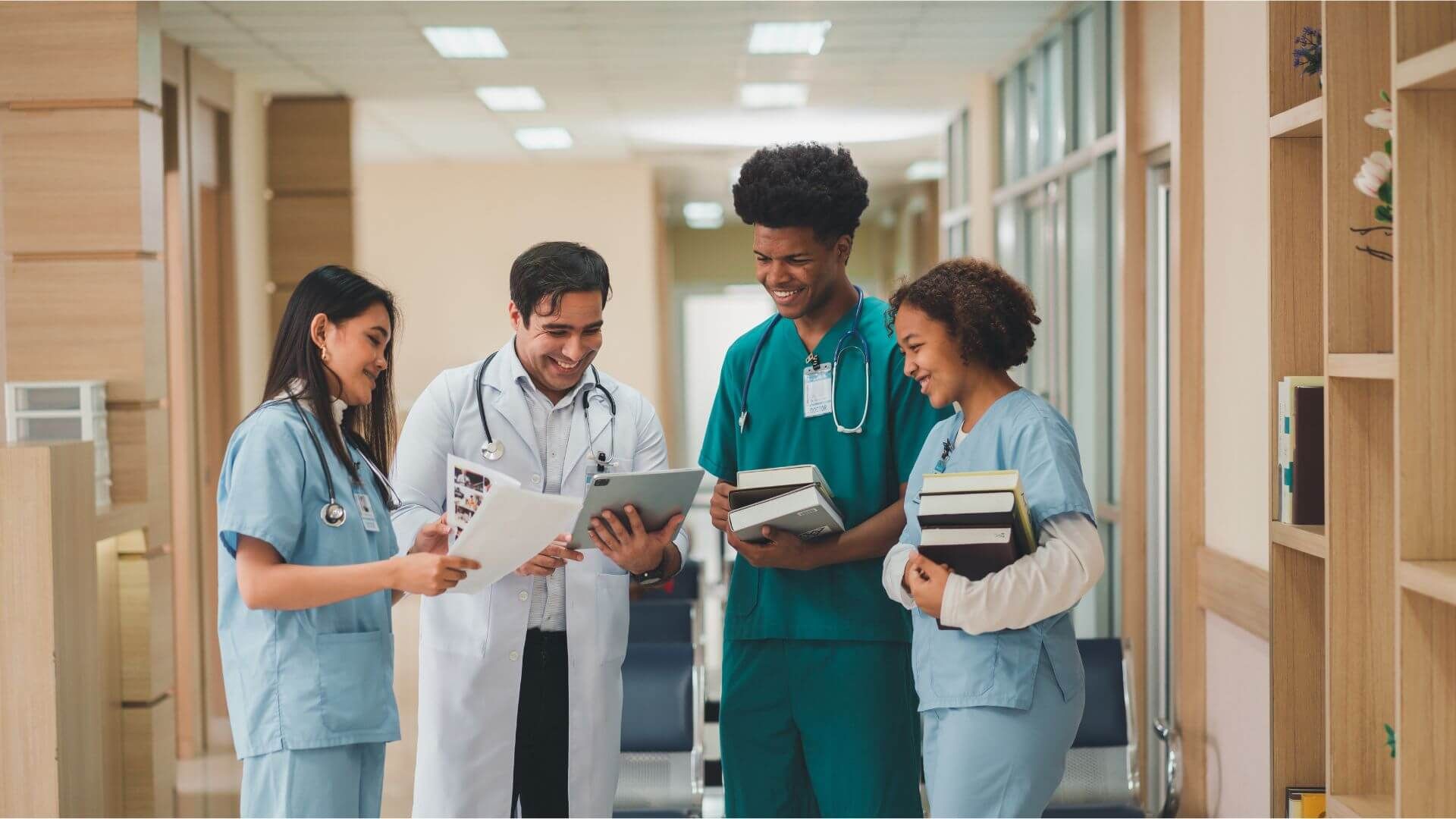 Assistenzärzte stehen einem Krankenhausflur um einen Oberarzt herum und werden von diesem bei ihrem Berufseinstieg begleitet